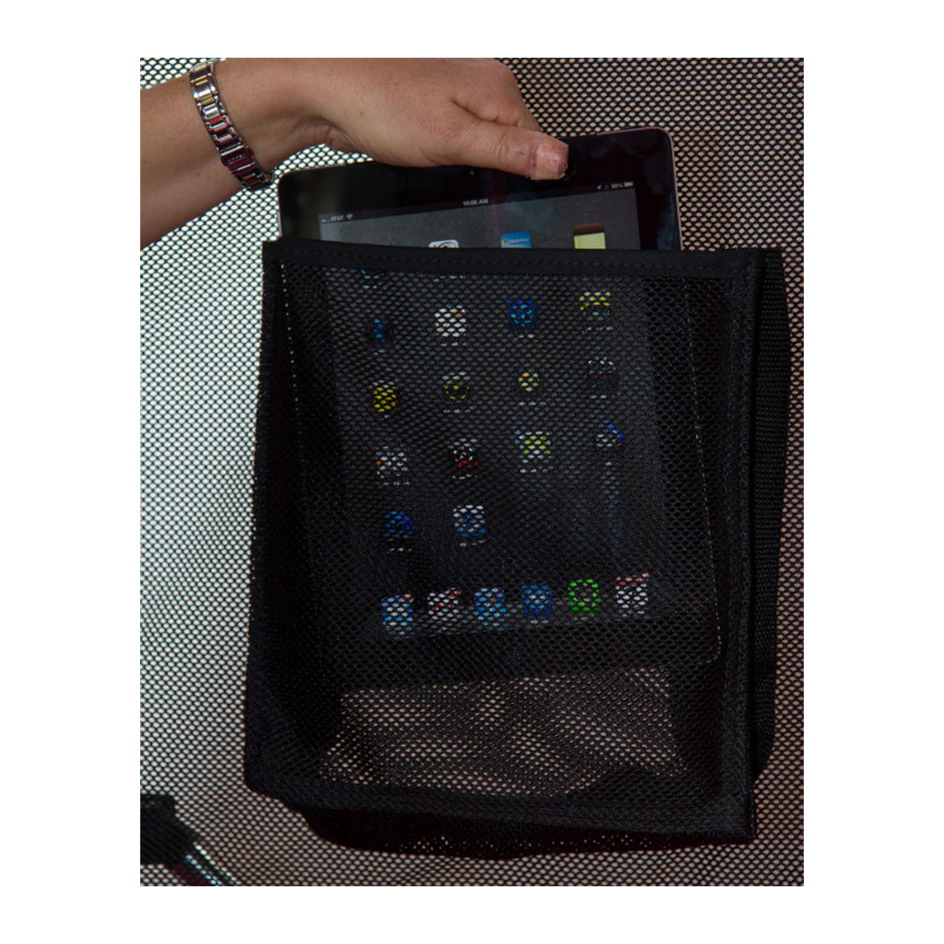 The inside pocket is described as an 8″ × 10″ black mesh storage pocket that can be added to the enclosure for storing communication devices, glasses, toys, and other small items.