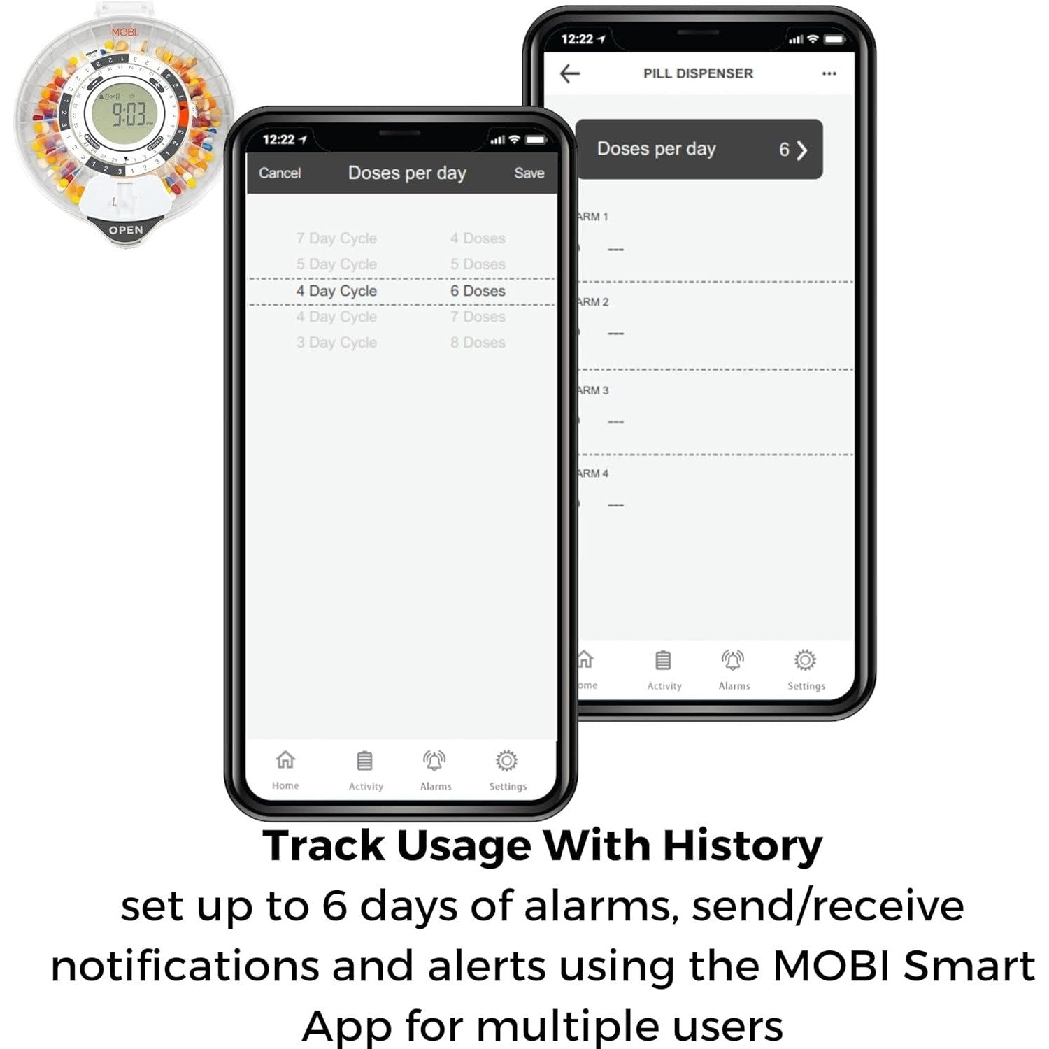 - Recordatorios diarios automáticos Los usuarios pueden configurar hasta 6 recordatorios diarios con la app MOBI o usar el dispensador manualmente para recordarles cuándo es hora de tomar la medicación. Una alarma sonará en ambos dispositivos hasta que se abra la tapa y se tome la medicación.