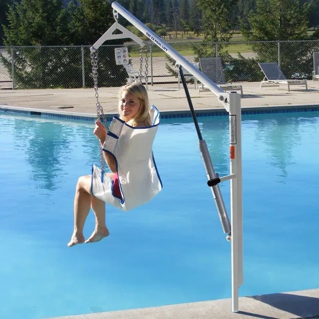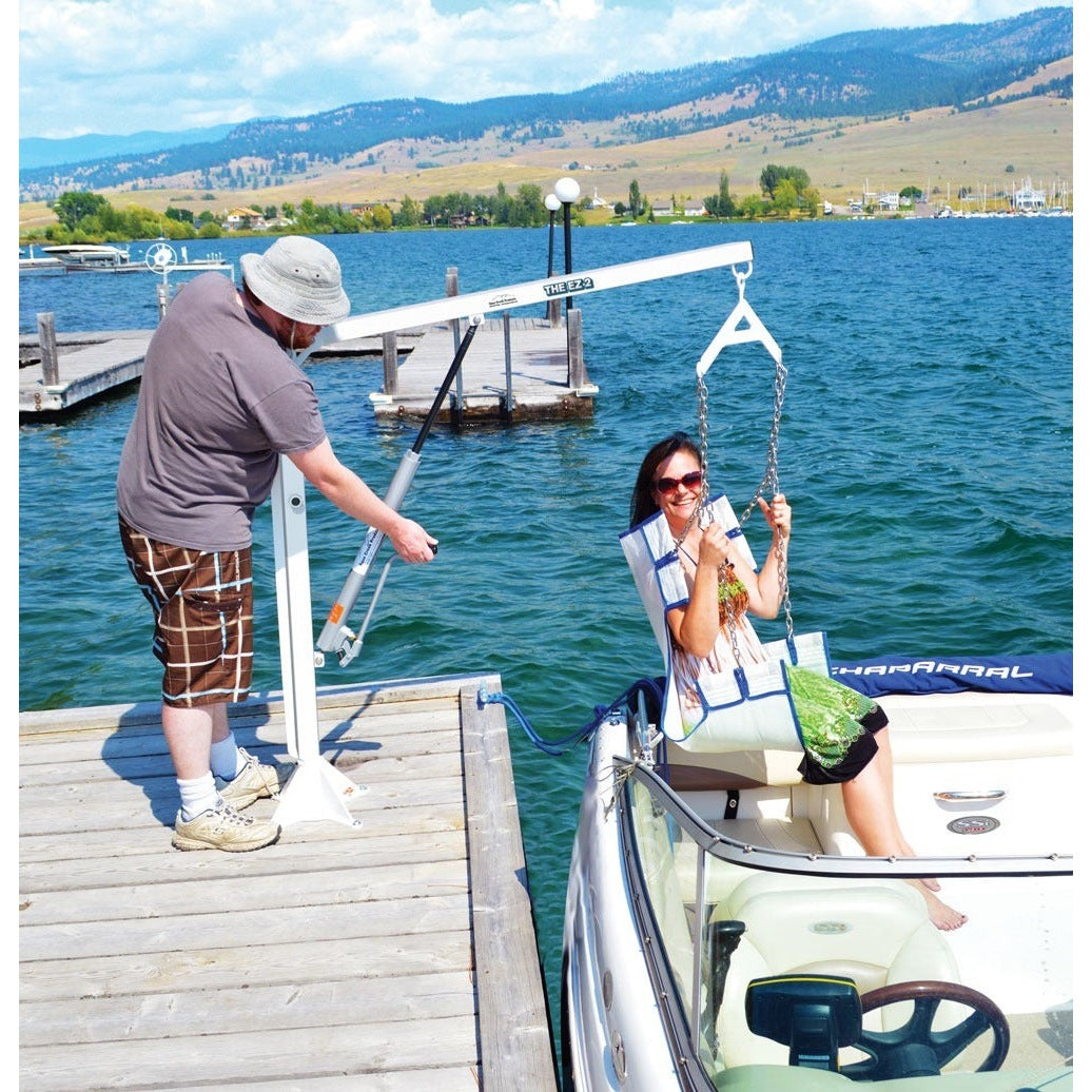 It is easily portable for storage and/or relocation to another dock or pool area. With its affordability and compact design, this lift is excellent for residential applications. The EZ 2 Lift comes with a mesh sling seat and additional seat options are available.