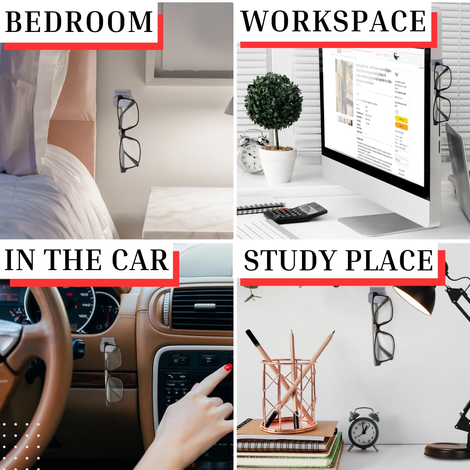 - Hang Anywhere - With 6 holders per pack you can hang your glasses exactly where you need them. Place one on your car dash as a sunglasses holder, and one beside your power tools in the workshop to always have a set of protective glasses when needed. And don't forget about the desk - one to the side of your computer monitor so your glasses are within reach. The options are endless!