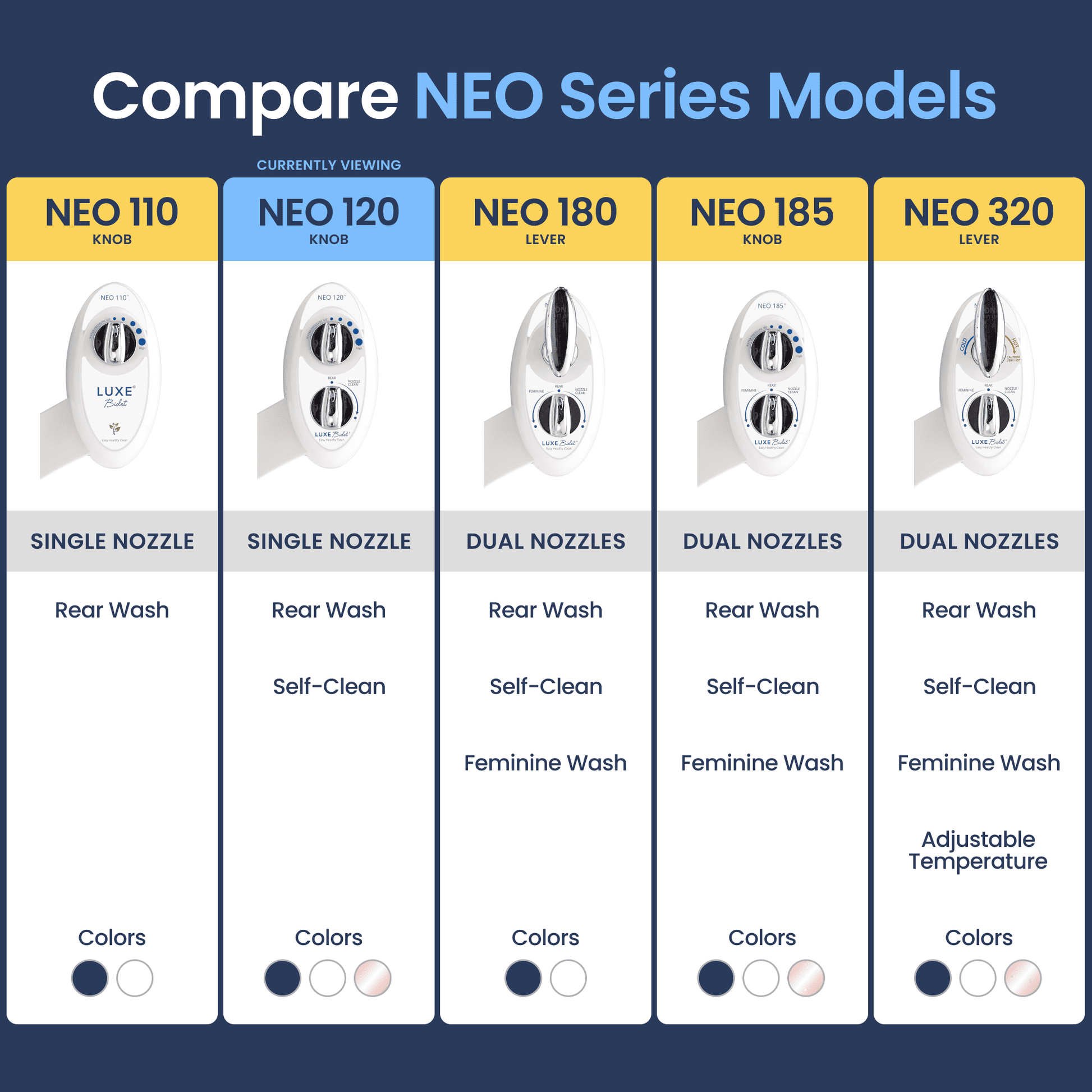 The LUXE Bidet NEO 120 is a cold water bidet equipped with a single wash mode and self-cleaning function.