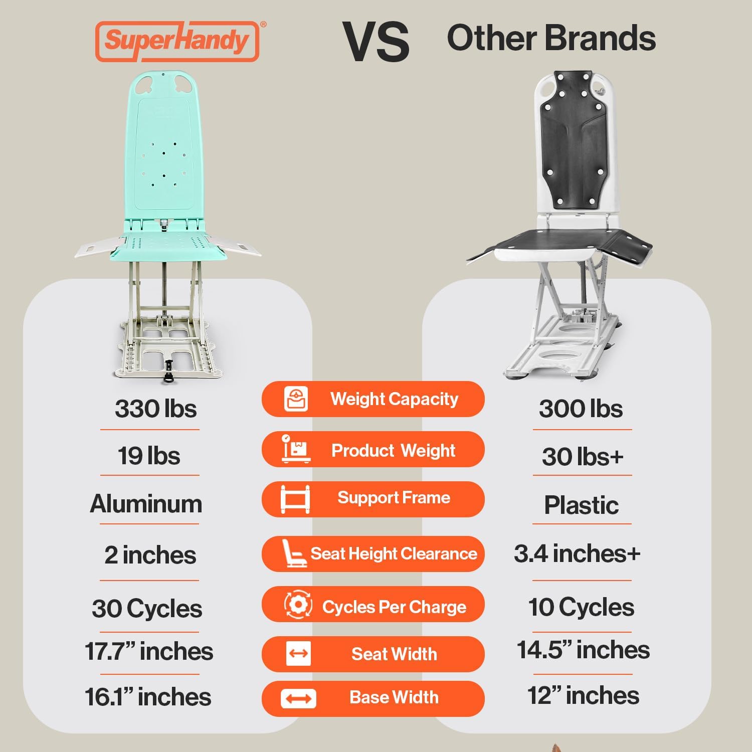 The SuperHandy GoRise LT offers unmatched lifting capabilities with its 330 lbs capacity. At only 19 lbs, this foldable lift is incredibly lightweight and features an IP68 waterproof rating, making it perfect for any environment. Its ergonomic seat and intuitive controls ensure easy operation, while the removable side panels provide versatile access.
