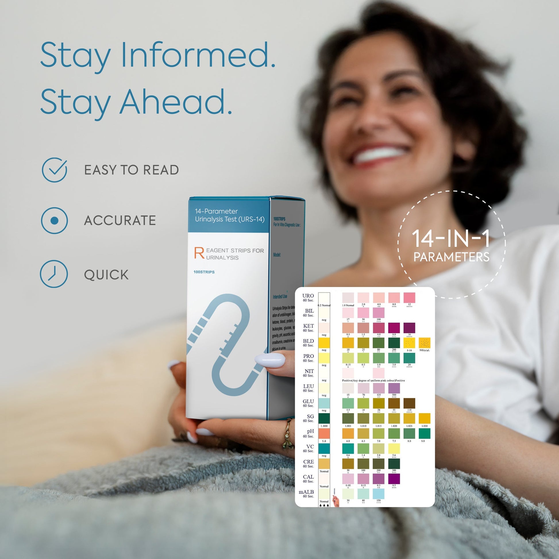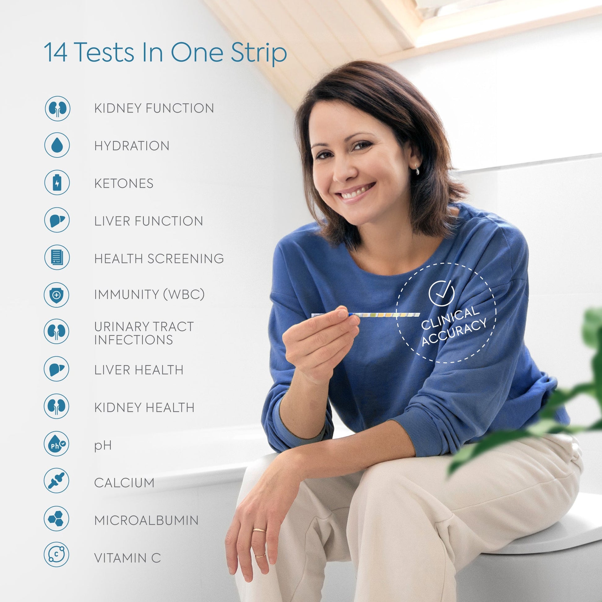 - 14-in-1 Urine Test Strips - Monitor your health from the comfort of home with our 14-parameter urinalysis test strips. Each strip tests for Leukocytes, Nitrite, Urobilinogen, Protein, pH, Blood, Ketones, Specific Gravity, Bilirubin, Micro-albumin, Creatinine, Vitamin C, Calcium, and Glucose.